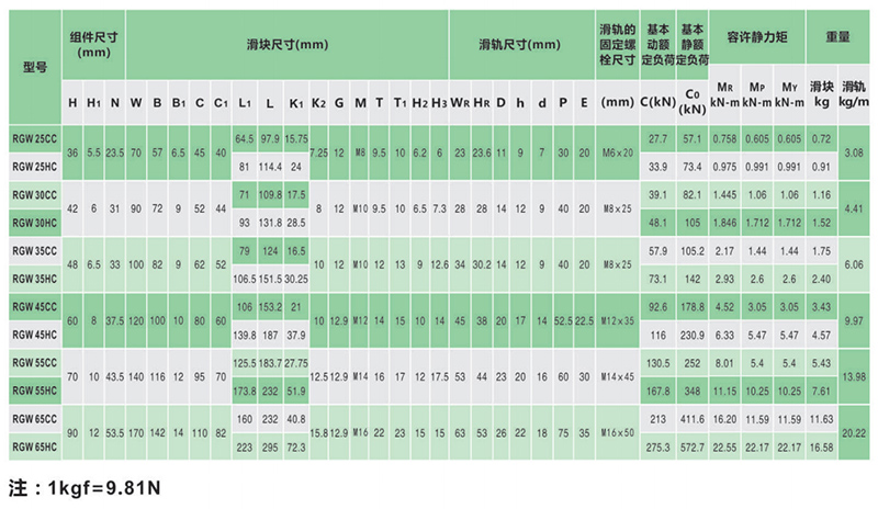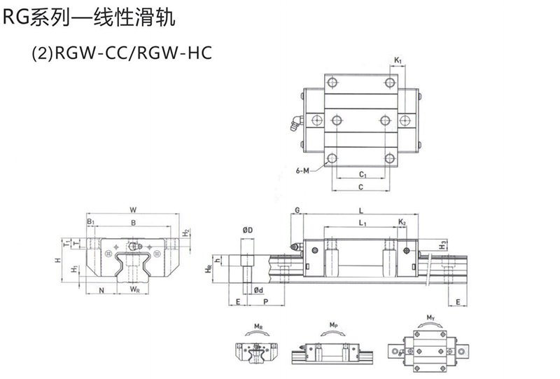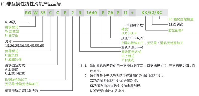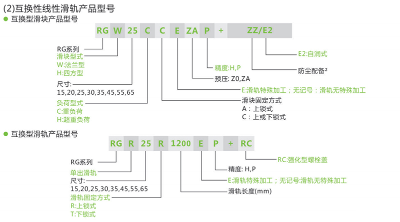 RG系列分為非互換性及互換性型兩種線性滑軌,兩者規(guī)格尺寸相同,主要差異點(diǎn)在于互換性型之滑塊、滑軌可單獨(dú)互換使用,較便利,但其組合精度無法達(dá)到非互換性型之超精密級(jí)以上的精度, 不過由于CHAO YIN互換性型之組合精度目前已達(dá)到一定的水準(zhǔn), 對(duì)不需配對(duì)安裝線性滑軌的客戶而言,是一項(xiàng)便利的選擇。線性滑軌的產(chǎn)品規(guī)格型號(hào)主要標(biāo)明線性滑軌尺寸、型式、精度等級(jí)、預(yù)壓等規(guī)格要求,以利訂貨時(shí)雙方對(duì)產(chǎn)品的確認(rèn)。